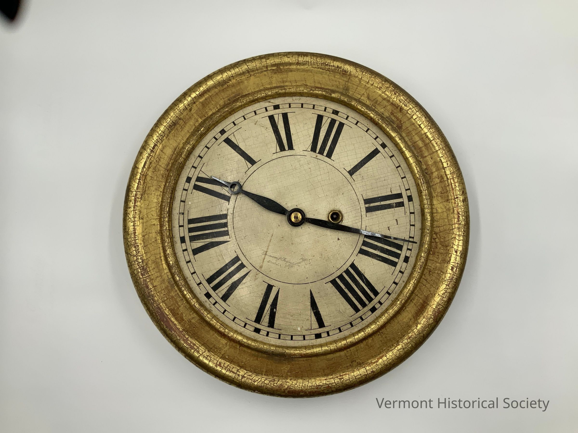 Round gilt-framed wall clock. The molded gilt frame houses a round, painted dial with Roman numerals, black-lacquered metal hands, and a brass single winding hole. The face is inscribed, "Brewster & Ingraham / Bristol CT" just above the VI. The clock has a pendulum mechanism and the frame has a hinged and latched back to secure the clock inside.Context
