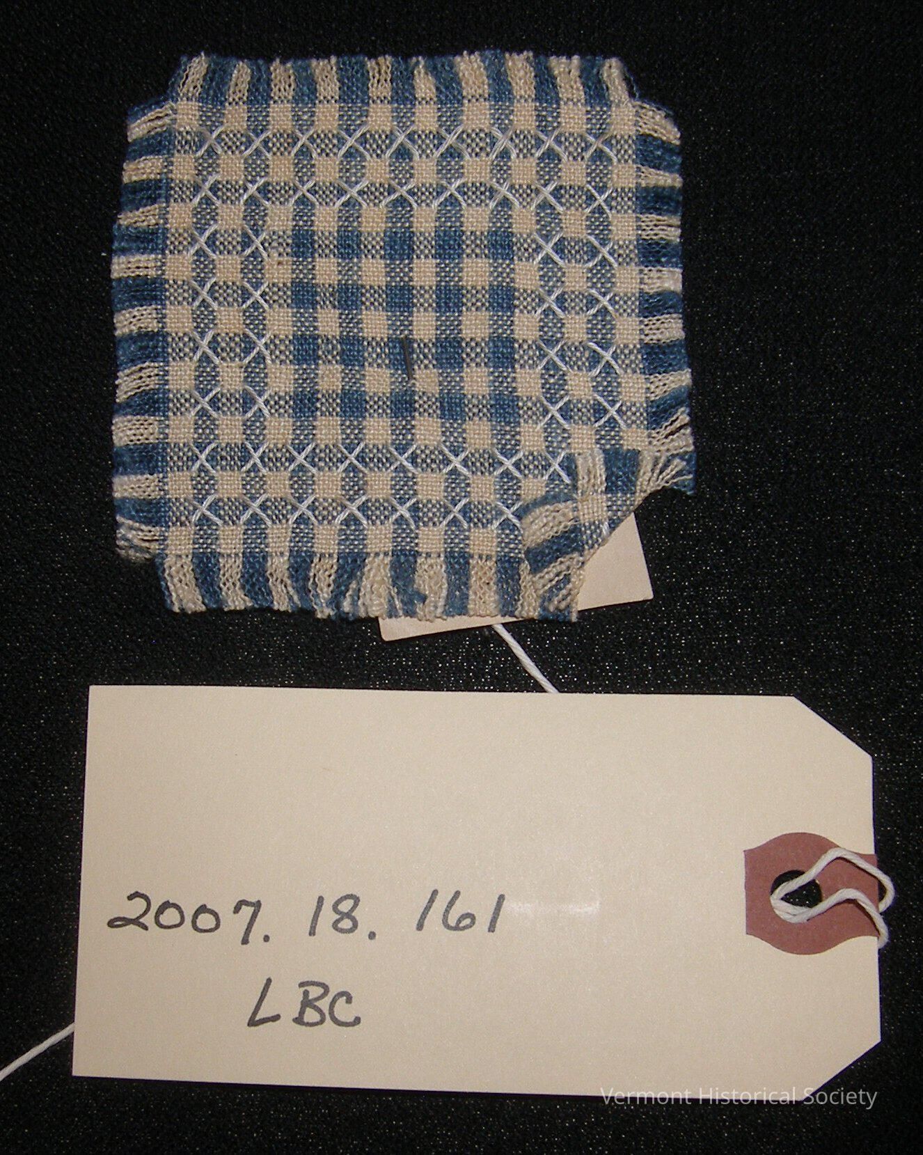 Plain-woven blue checked coaster. It is decorated with simple embroider in white Xs over blue squares. The edges are fringed.