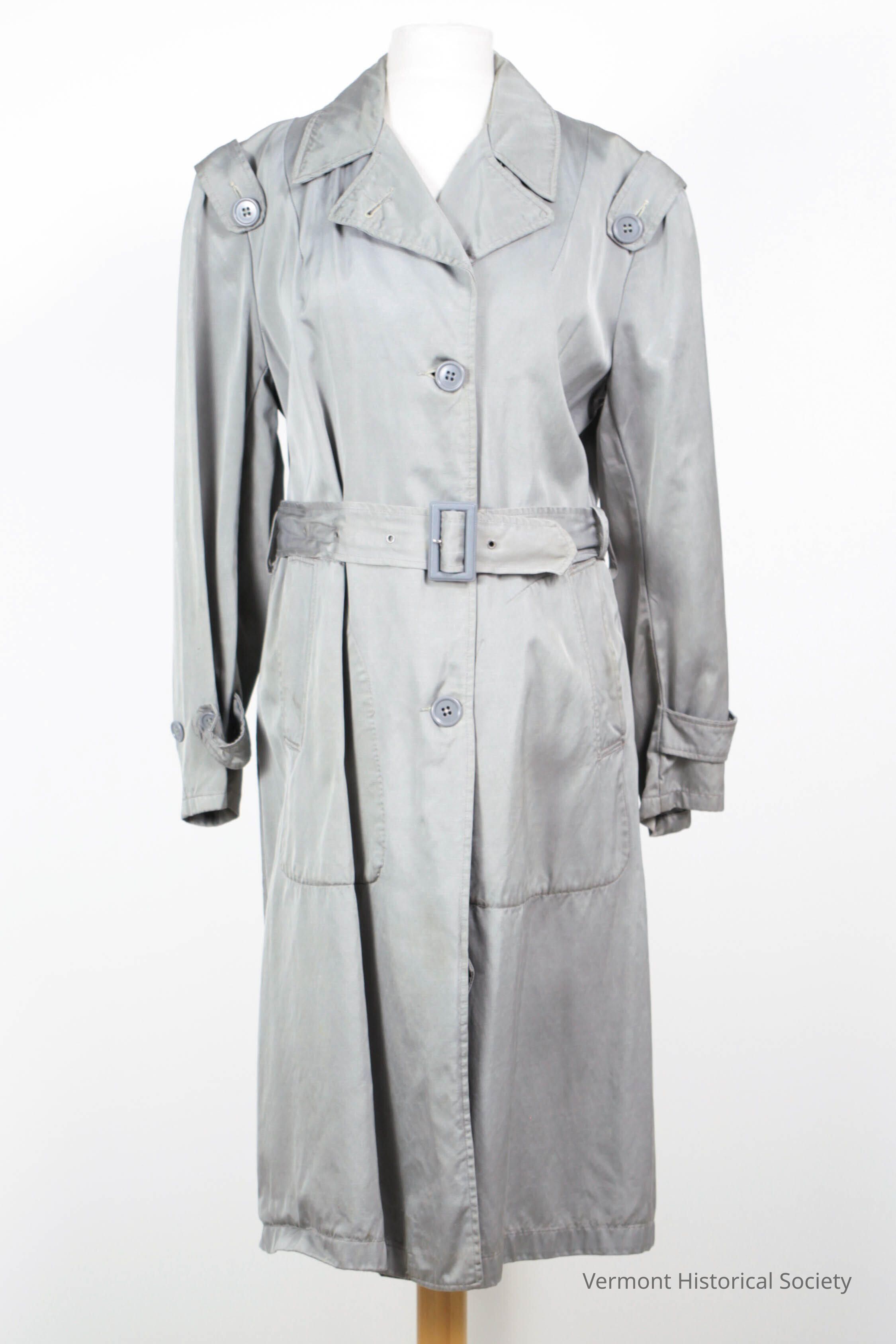 Grey nylon raincoat. The coat opens down the center front and secures with three buttons. There is a belt that goes around the waist and secures with a plastic buckle. There are two pockets at the front hips. There are self-fabric epaulets at the shoulders that secure with buttons. There are pockets set into the side seams on both sides. There is a label inside the neck facing that reads, "U.S. Nurse Corps / Name: Amelia E. Brown / School: Mary Hitchcock Mem. / Hanover, N.H."Context