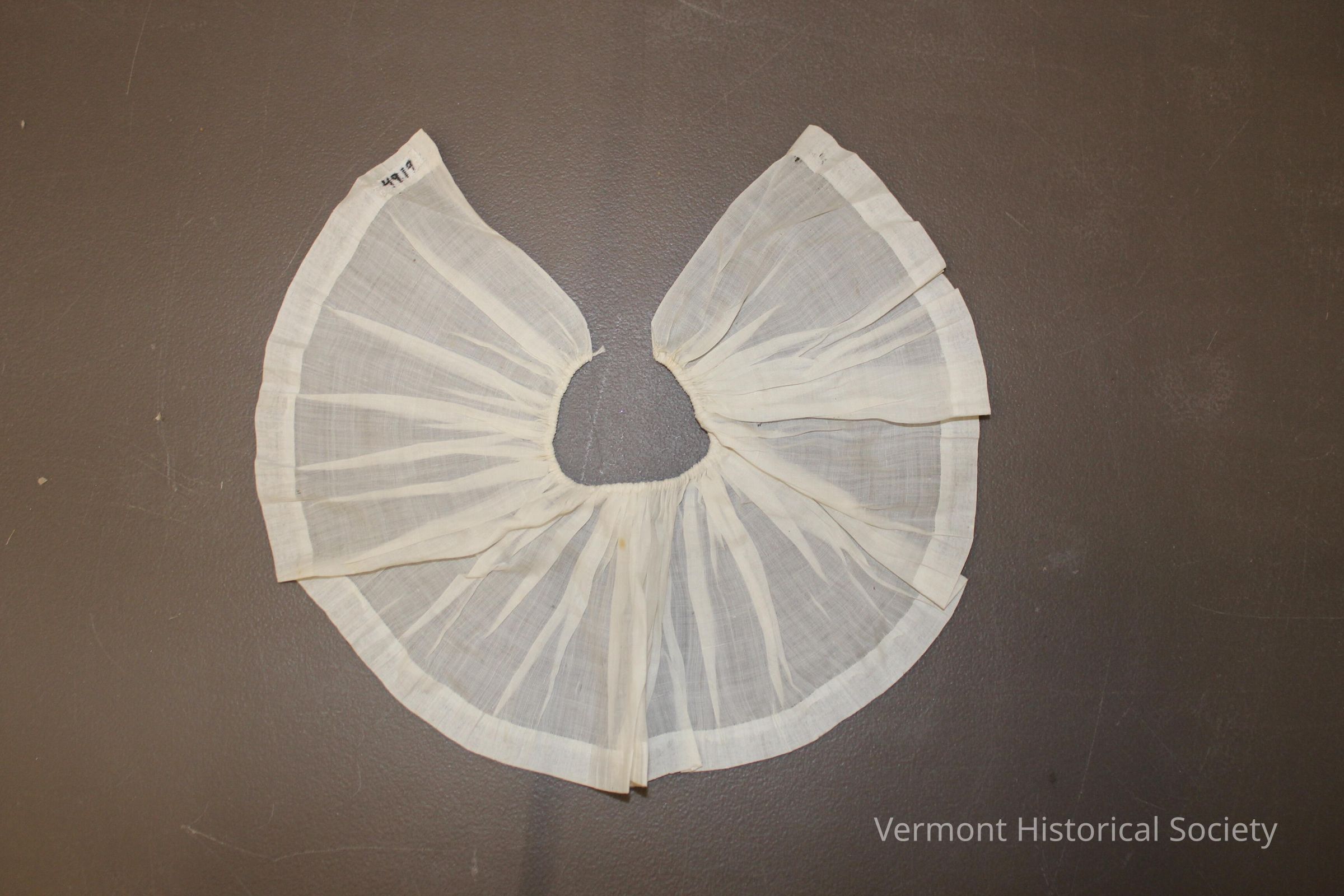 White cotton collar. The color is made from a rectangle of fabric, gathered around a drawstring along the inner edge and with a wide hem around the outer edge.