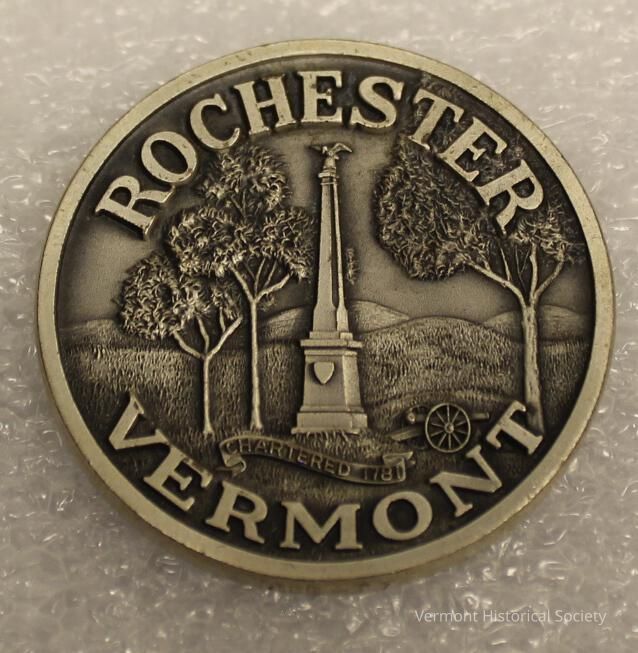 Sterling silver commemorative medal. One side shows an obelisk monument topped with an eagle set amid rolling hills and trees with the inscription, "ROCHESTER VERMONT." The other side shows a flying eagle holding a ribbon that says, "EQUALITY JUSTICE LIBERTY" in front of the inscription, "AMERICAN REVOLUTION BICENTENNIAL 1776-1976."Context