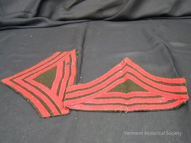 Two insignia patches in the shape of triangles (chevrons with an upper bar) made of three red stripes over a black ground.