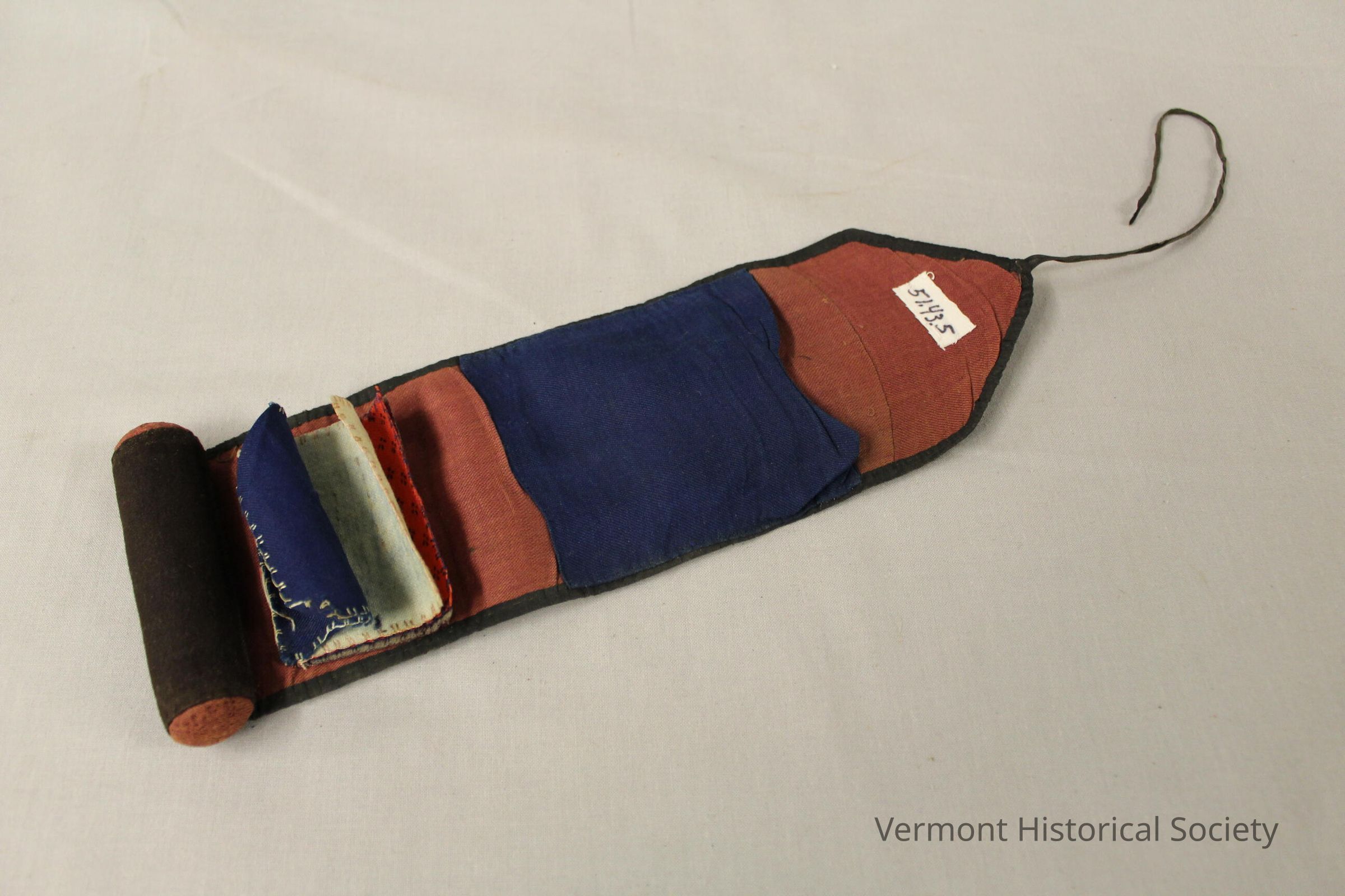 Roll-up sewing case consisting of a round, stuffed tube and long fabric flap. The long flap has three small patches, attached only at one side on top of each other: the bottom is a red black-sprigged calico, the middle is a white cotton, and the top is blue wool. The center of the flap has a blue pocket.