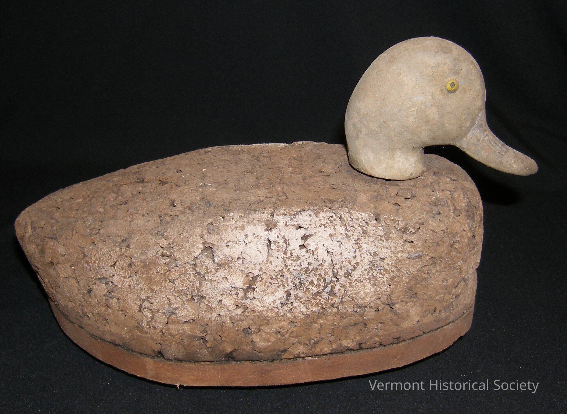 The duck has a cork body and a pre-made head that is man-made material and has a seam that goes over the head and and around it. The cork body is oval and has a slightly pointed 'tail' end. The cork is attached to a piece of wood (.69" thick) by nails. A screw eye is in the wood 2" from the front. A lead weight has been nailed down the center of the bottom