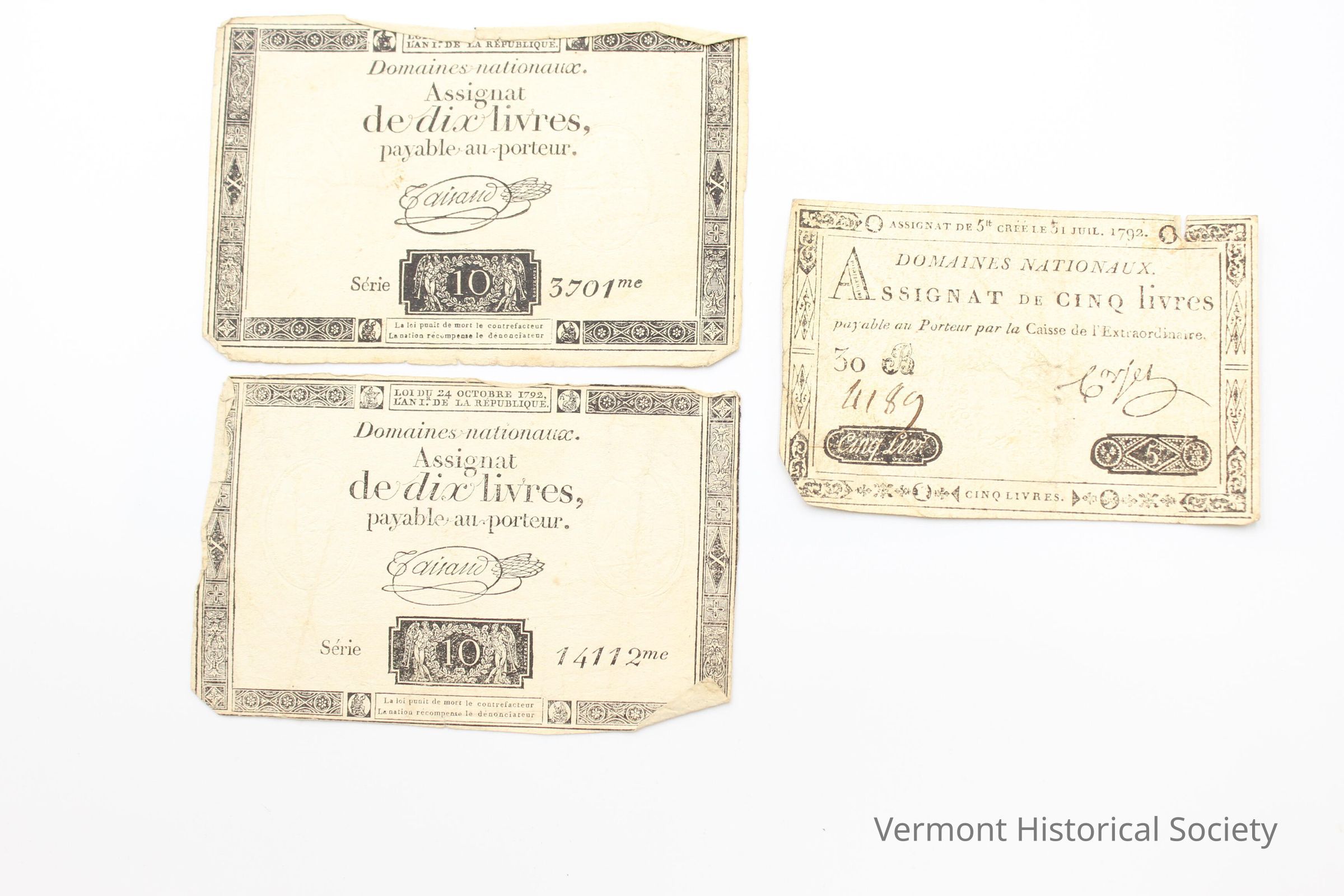 The Assignat notes of the French Revolution were issued from 1790 - 1796. These are printed on only one side. There is a long note and envelop with the money from a man from Paris. He says thanks for the friendship train that the U.S. sent over earlier.Context