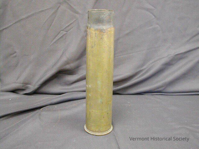 Large metal artillery shell. The shell narrows slightly at the top edge, and has a heavy round base.
