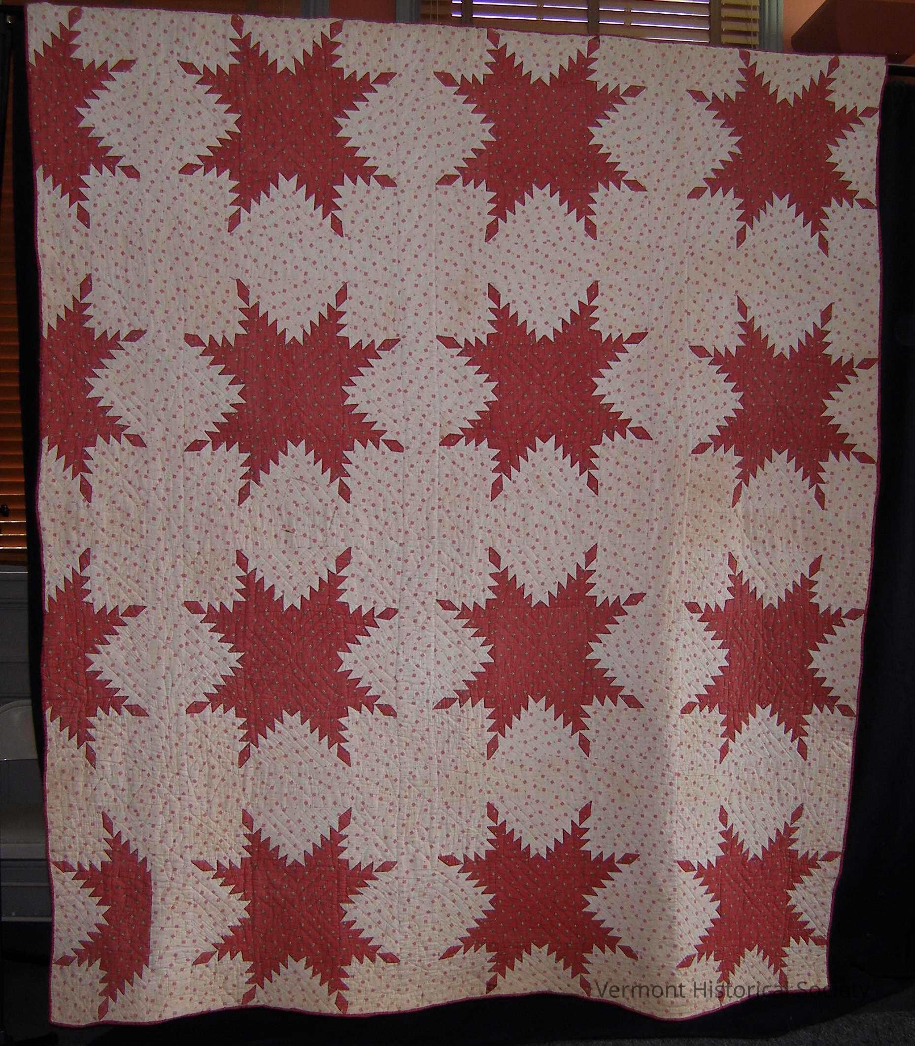 Red and white pieced quilt in a feathered star pattern, likely a variation of a California Star pattern. The quilt is pieced from two fabrics: a white cotton printed with small red flowers and a red cotton printed with blue-and-tan flower buds. It is hand quilted.Context