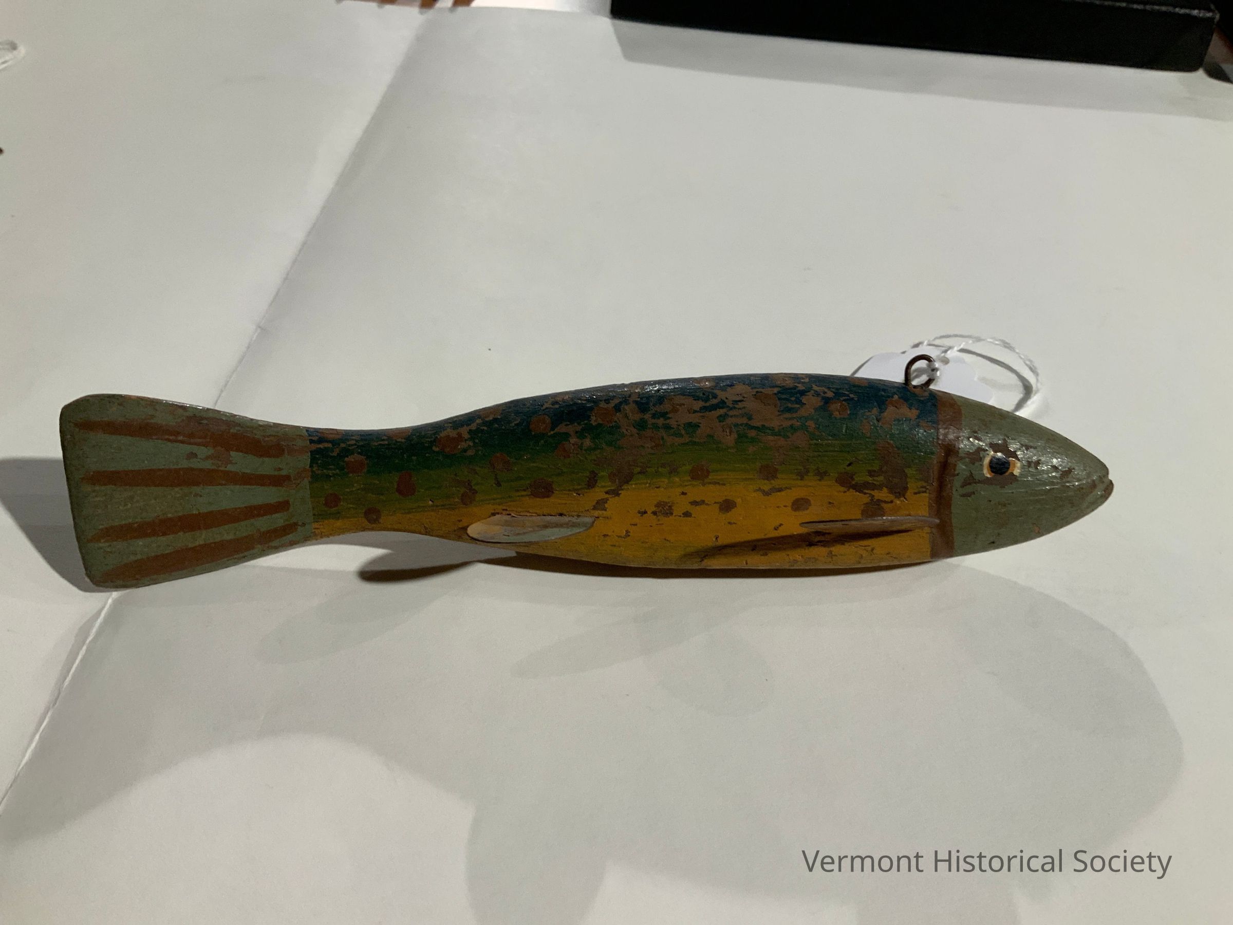 Hand-painted wooden fish decoy. The carved wooden fish has a green head, blue-green speckled back, and yellow belly. There is a metal hook affixed at the top where the head and body meet, and there are two painted metal fins affixed to each side.