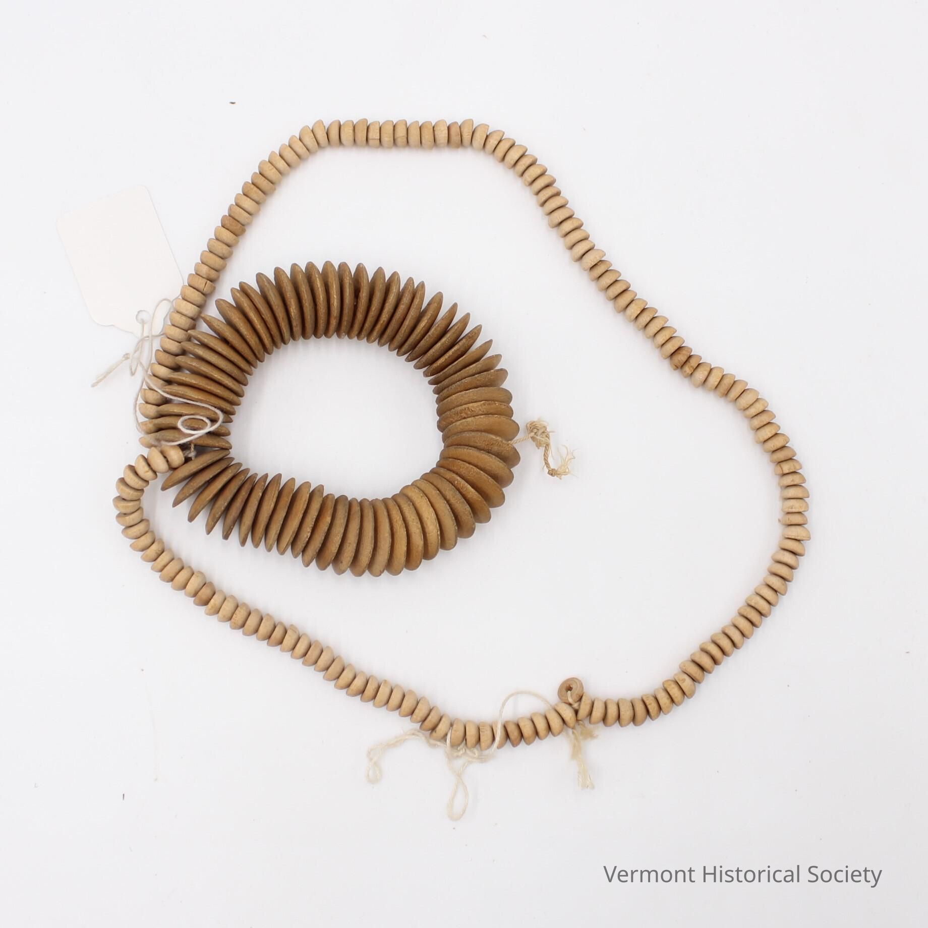 Two strings of unpainted, turned wooden beads tied together. Both of the beads are shaped like domes with one flat side and the other side convex.Context