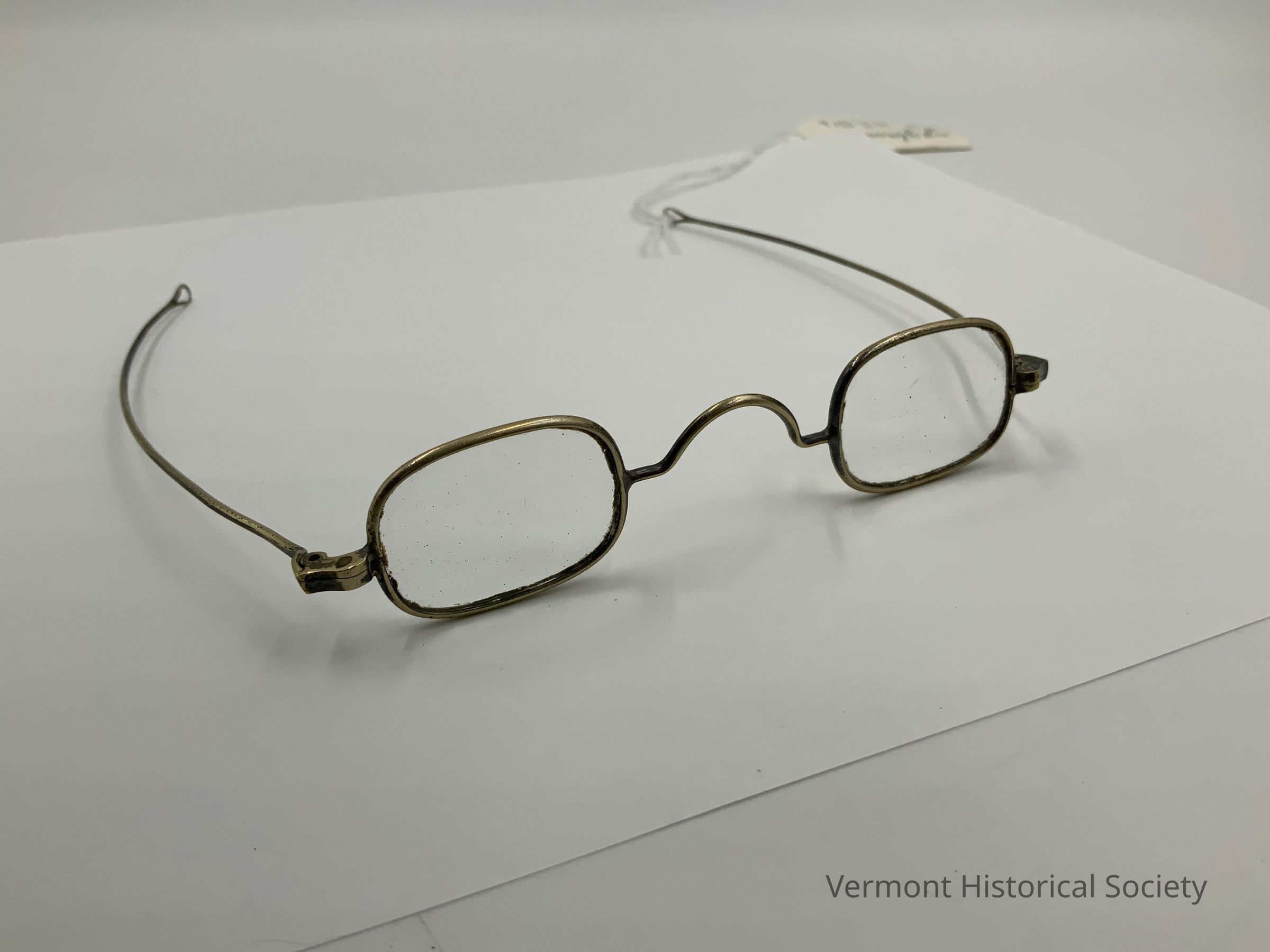Metal framed eyeglasses with clear, rectangular lenses. The temples are heavy-gauge wire, and each has a loop at the end. The bridge is shaped into a semicircle.