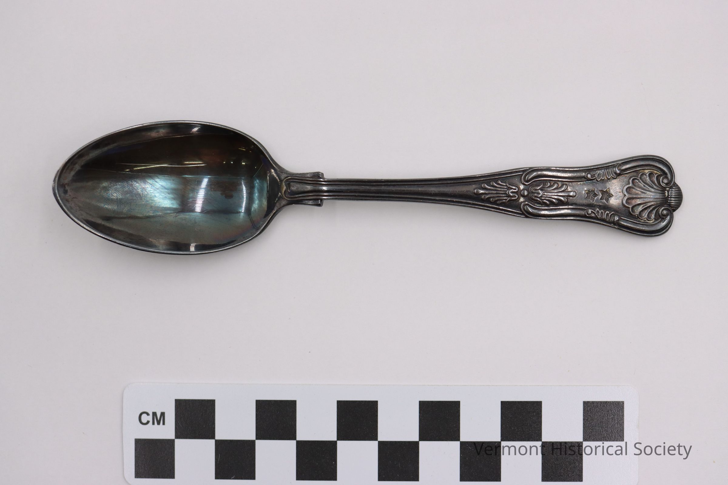 Silver-plated teaspoon with an ornately molded handle. The front of the handle is stamped with two 5-pointed stars. The handle is stamped on the back with the label, "USN", within the decorative cartouche. The back stem of the handle is marked, "1847 Sterling Plate".
