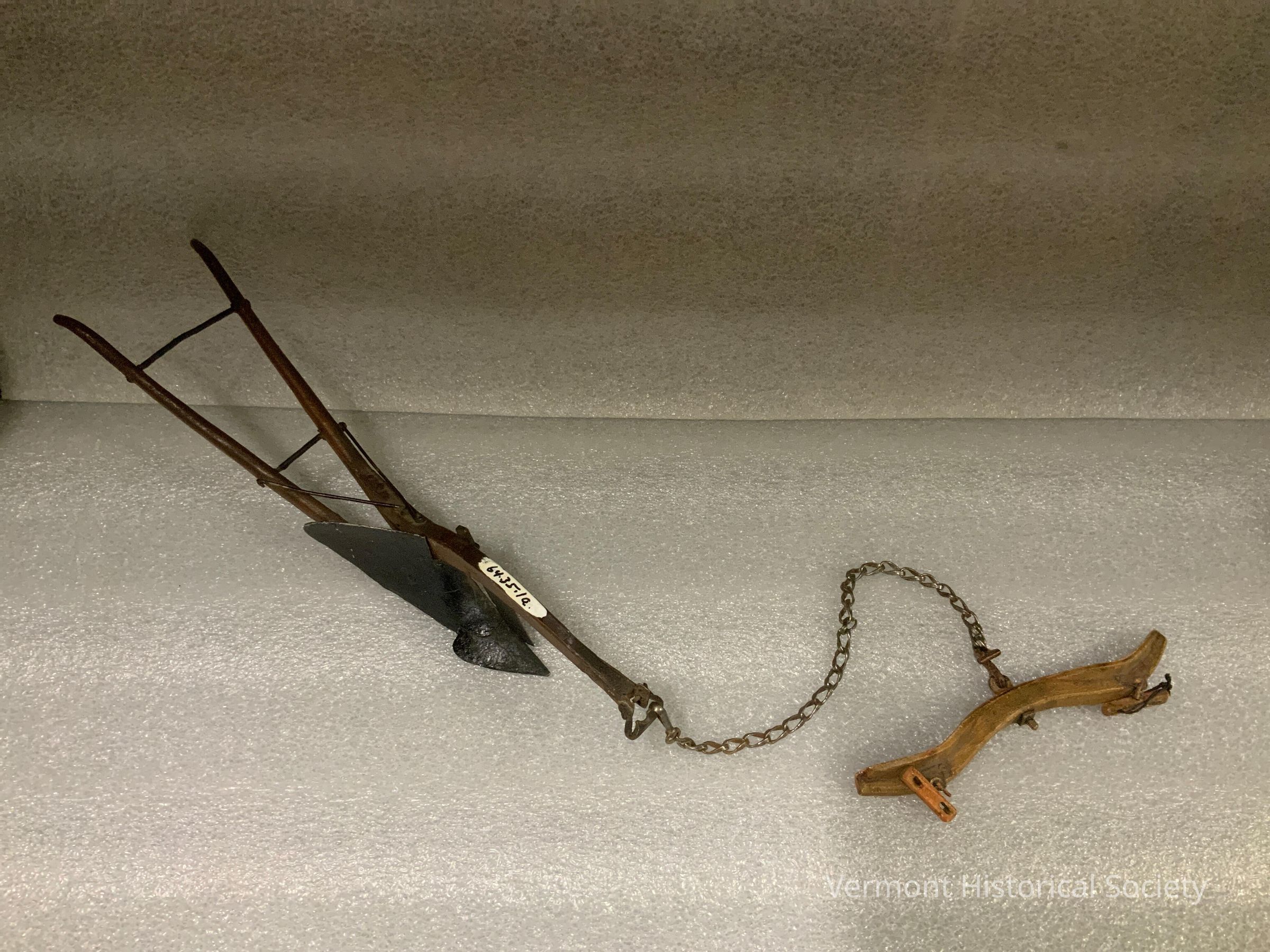 Miniature plow with a two-oxen yoke attached to the front by a chain. The plow consists of a metal blade with long wooden handles forming a V shape.Context