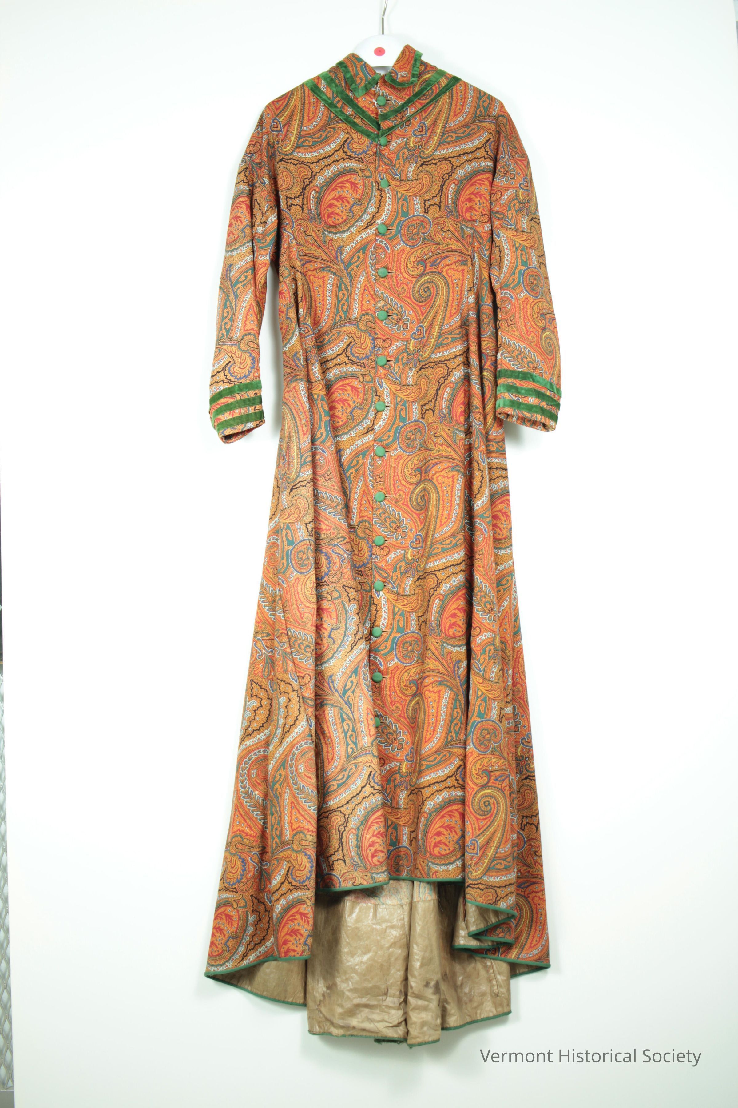 Paisley wool dressing gown trimmed with green velvet ribbon. The gown opens at the center front with green buttons. The bodice is lined with cotton calico. There is a train.Context