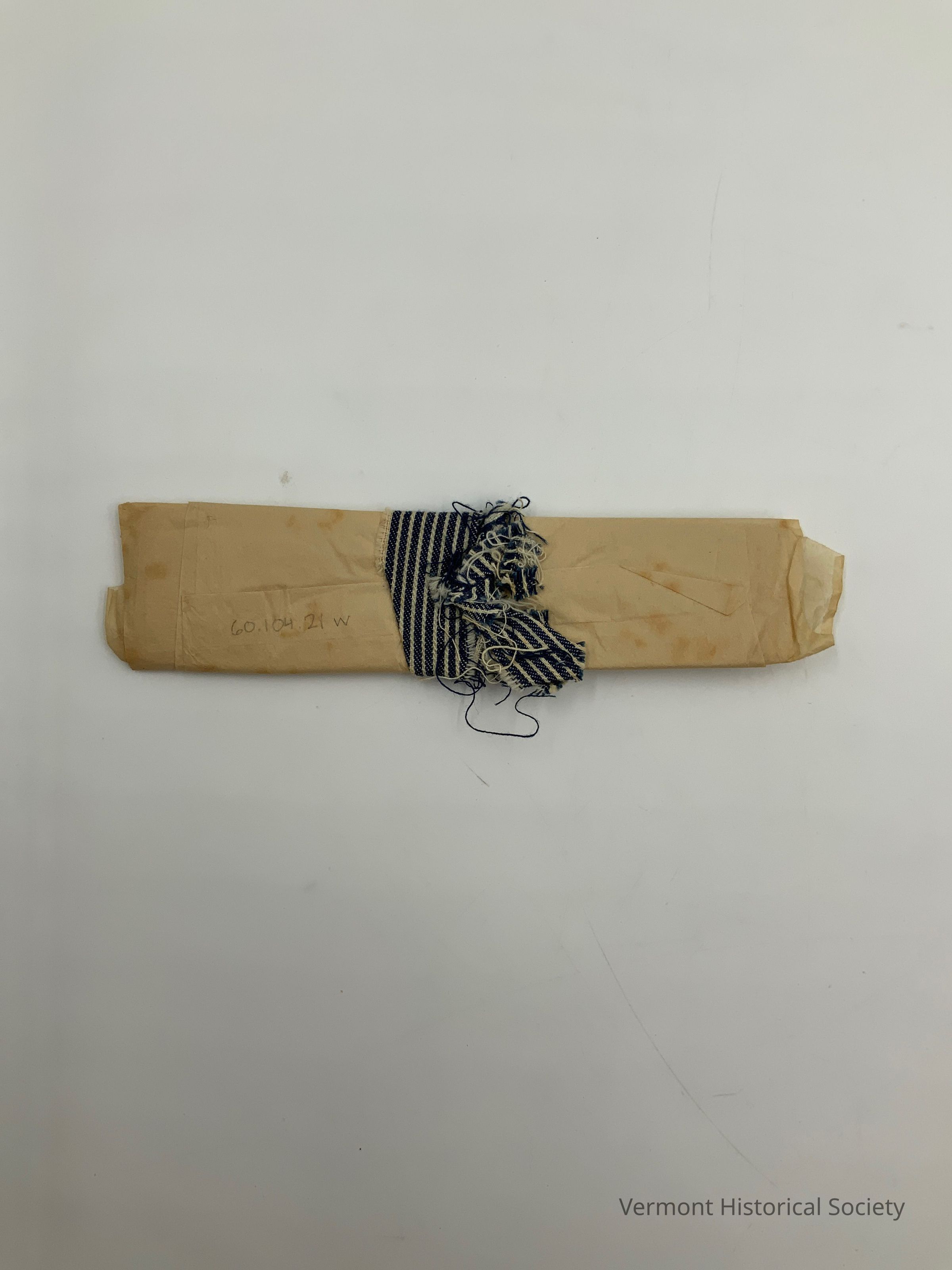 Cut tissue sewing pattern. The pieces are folded together and tied with a strip of blue-and-white cotton.