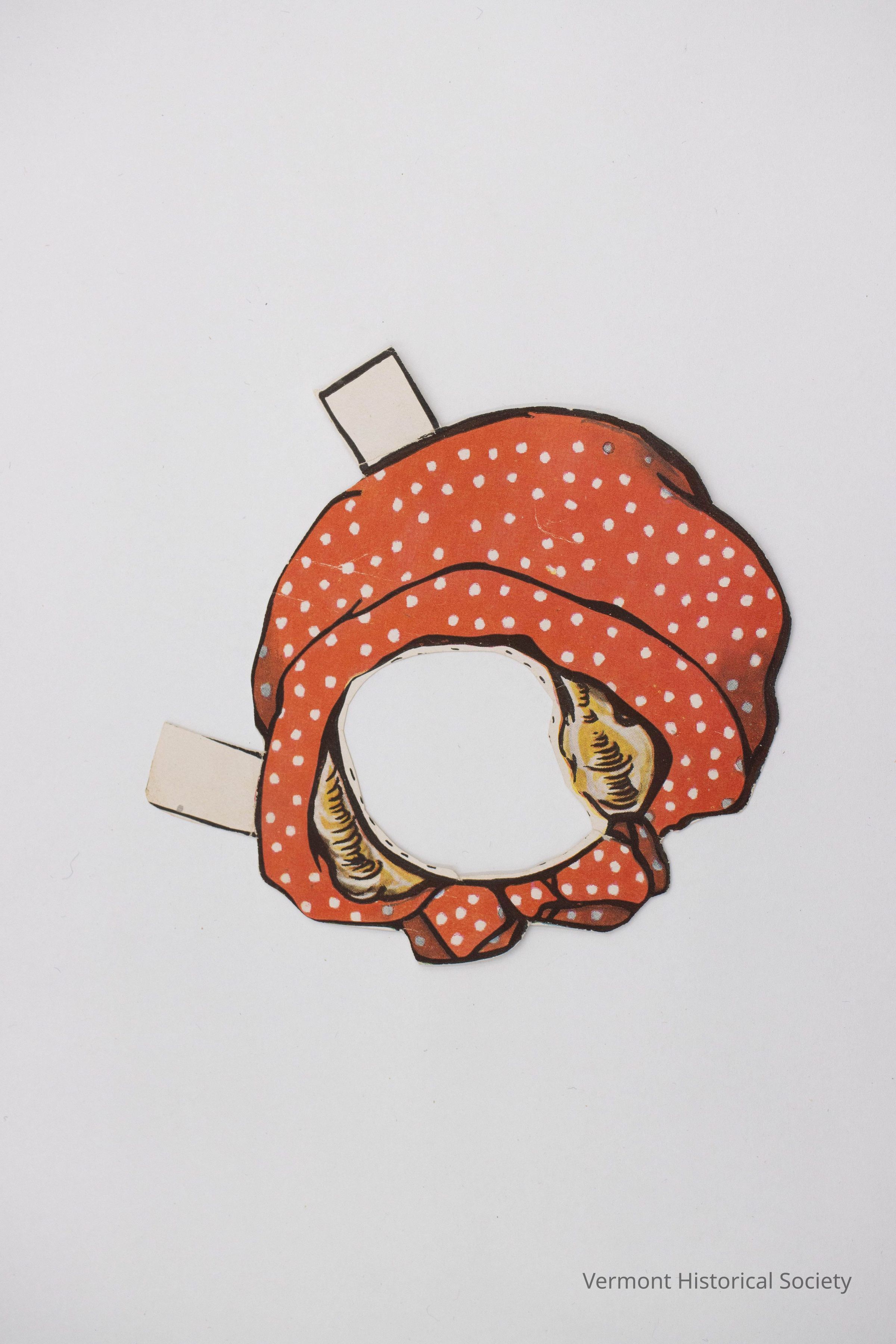 Red, printed paper cloak hood for a paper doll. There is yellow hair on either side of the face opening. The back shows a portion of a sales catalog page.Context