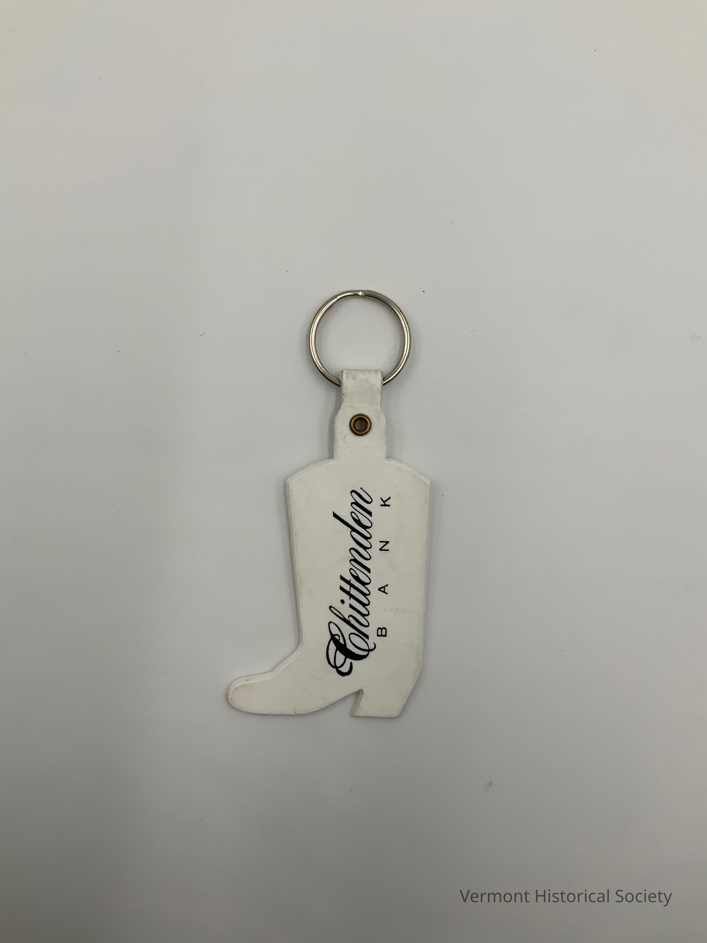 White rubber keyring cut in the shape of a cowboy boot. It is printed in black with the words, "Chittenden BANK".