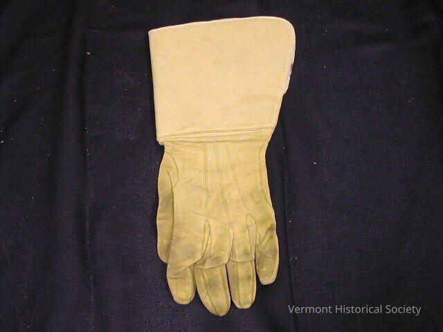 White leather glove with stiff, wide cuff. The inside of the cuff is inked with the inscription, "Lt. Col. Farnham 12th Vt. Vol. M". The glove is for the left hand.Context