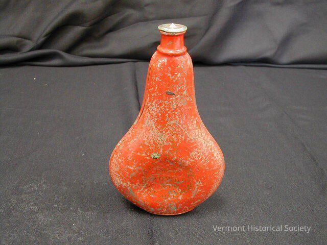 Orange-painted metal powder flask. The flask is pear shaped with a short-necked opening on the narrow end. The opening is sealed with a metal topped cork. There is a circular label that reads, "Dead Shot Rifle H. Rowell & Co. West Acton, Ms." The bottom is marked, "S8 17 7".