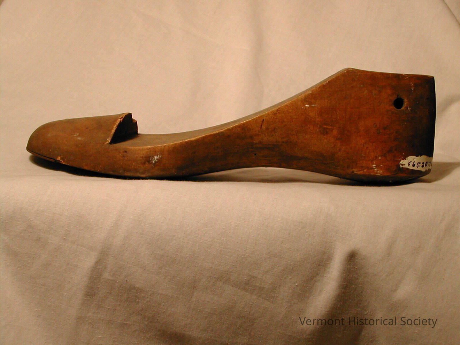 Wooden shoe last. The upper portion of the foot is cut away. There is a hole through the upper heel for hanging.