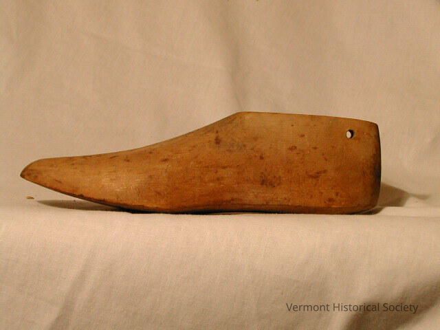Full-foot shoe last. The last is formed from a single piece of wood. It is carved straight (neither right nor left foot), and shaped for a square-toed child's shoe. There is a hole at the upper heel for hanging.