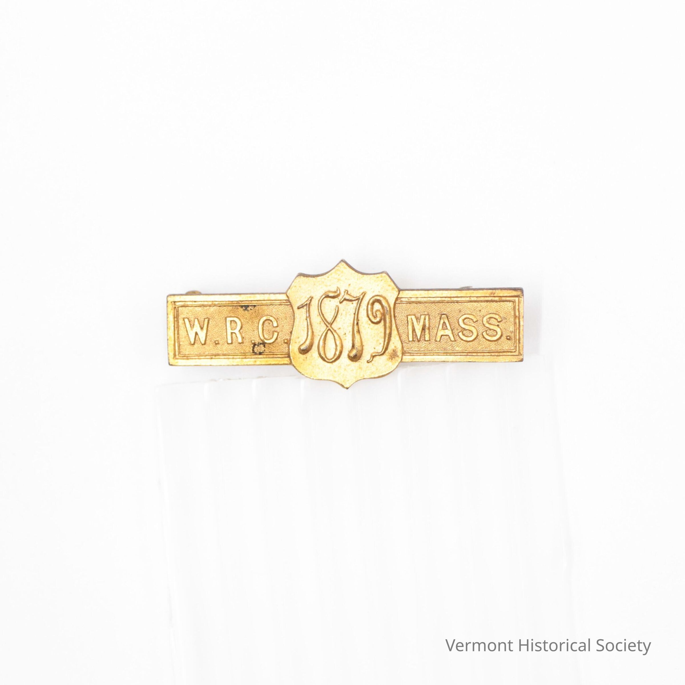 Gold-plated bar pin with the inscription, "W. R. C. MASS." and the date 1879 in a central shield.