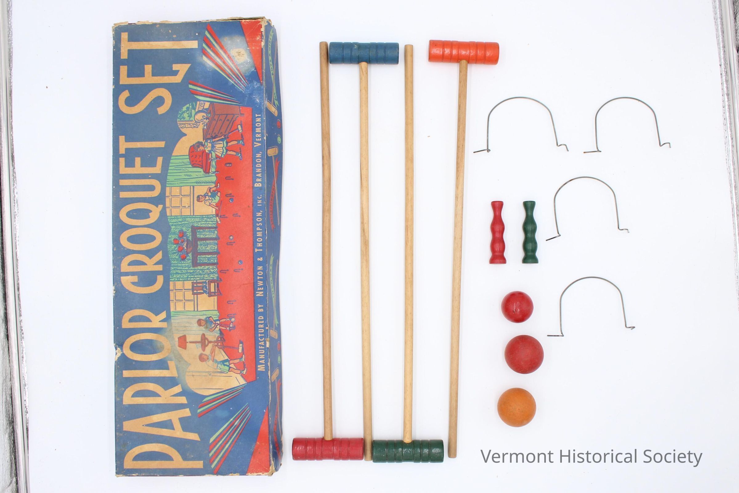 Croquet set consisting of 4 mallets, 3 balls, 2 pegs, 4 hoops, and a box with lid. The mallets have painted heads (blue, orange, red, green) with a glossy finish. The balls are turned wood. Two of the balls are the same size (red, yellow), and the third is smaller (red). The pegs are red and green and turned to have a flat end for resting on a flat surface. The hoops are made of wire that is bent into U-shapes at the ends for resting on a flat surface. The blue box lid is printed with an illustration of children playing croquet in a domestic interior with the label, "PARLOR CROQUET SET", across the top.Context