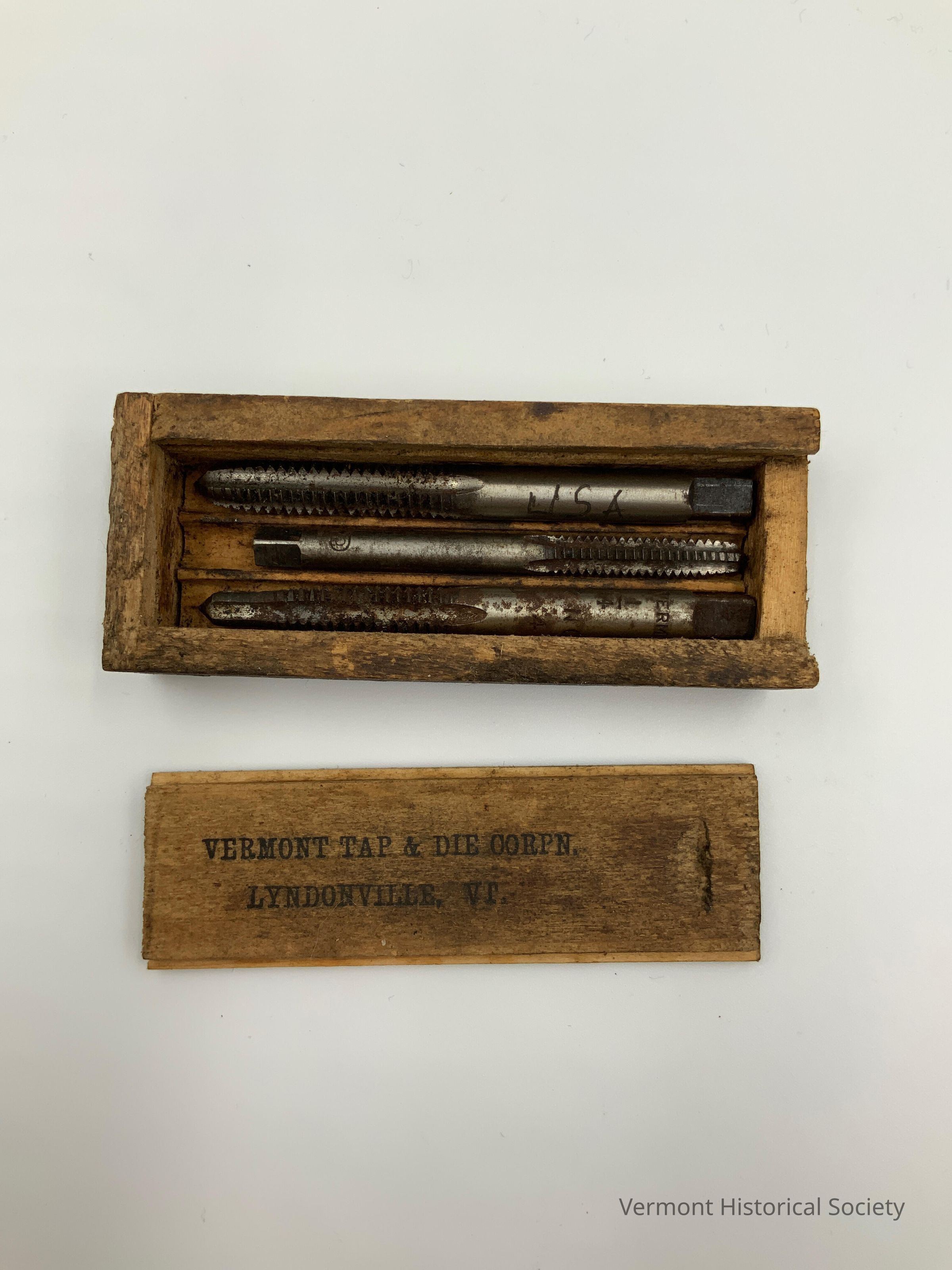 Small wooden box containing three metal bits. The lid slides off and reads, "VERMONT TAP & TIE CORPN. LYNDONVILLE, VT."Use
