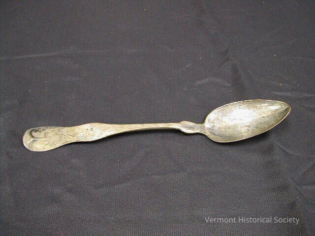 Silver spoon with rounded shoulders and a slightly pointed bowl.