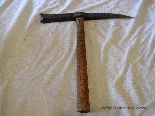 Wood handle, iron head pick-shaped at one end, widening to a 1" square bar at other end with letter "V" deeply cut for striking the butts of logs. Owner's logs could thus be itentified and sorted at the end of the river drive. The company owner was VanDyke, thus the "V".Context