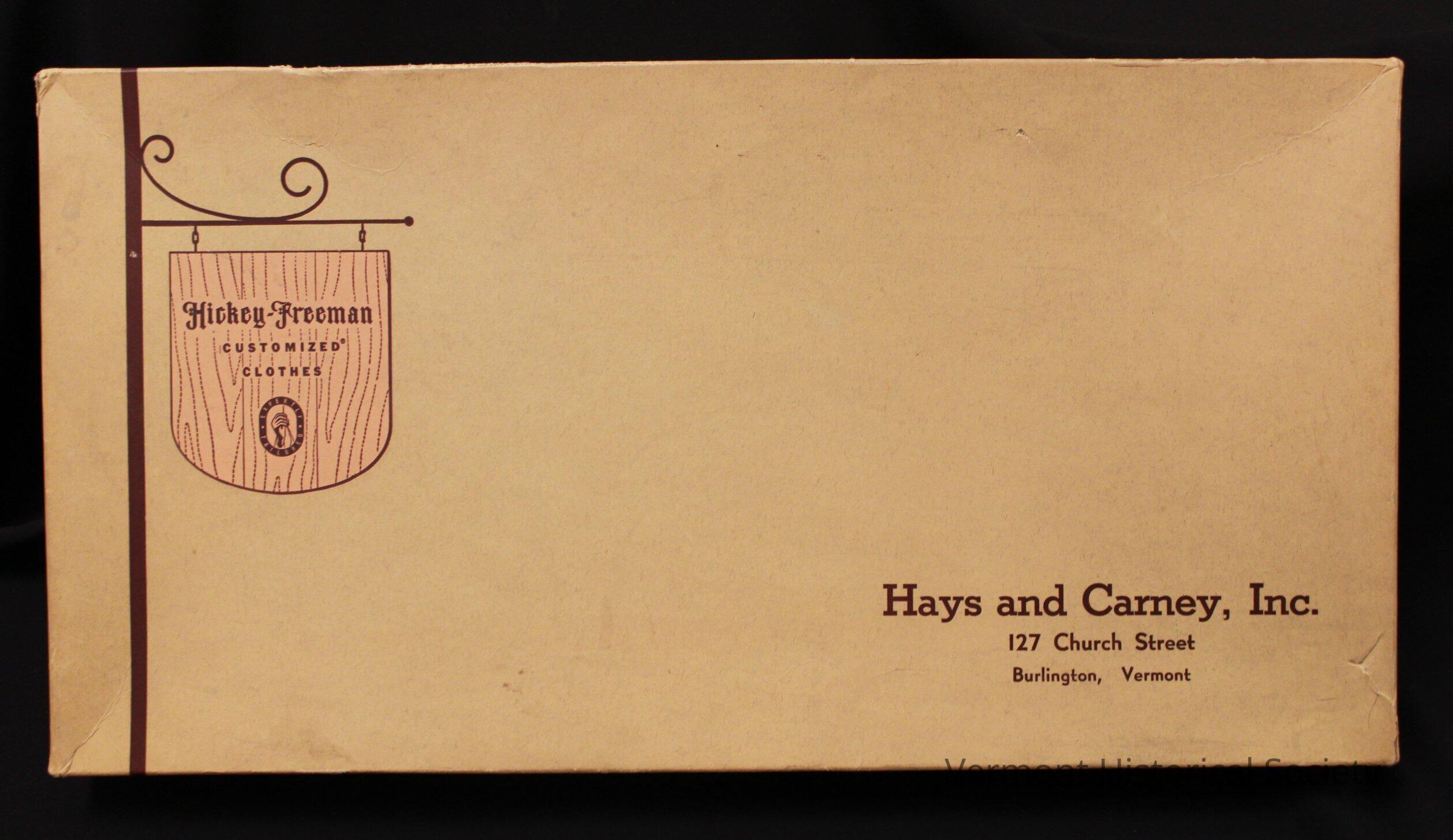 Large brown cardboard clothing box consisting of two pieces: the bottom (box) and top (lid). The left edge of the top is printed with an image of a trade sign hanging from a post. The sign reads, "Hickey-Freeman CUSTOMIZED CLOTHES" with a logo of a hand. The bottom right corner of the box has the inscription, "Hays and Carney, Inc. 127 Church Street Burlington, VermontAcquisition