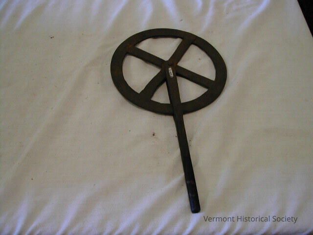 Hand forged iron tool for measuring the circumference of a wheel. It consists of a wheel with 4 spokes attached at center by a rivet to a handle.Context