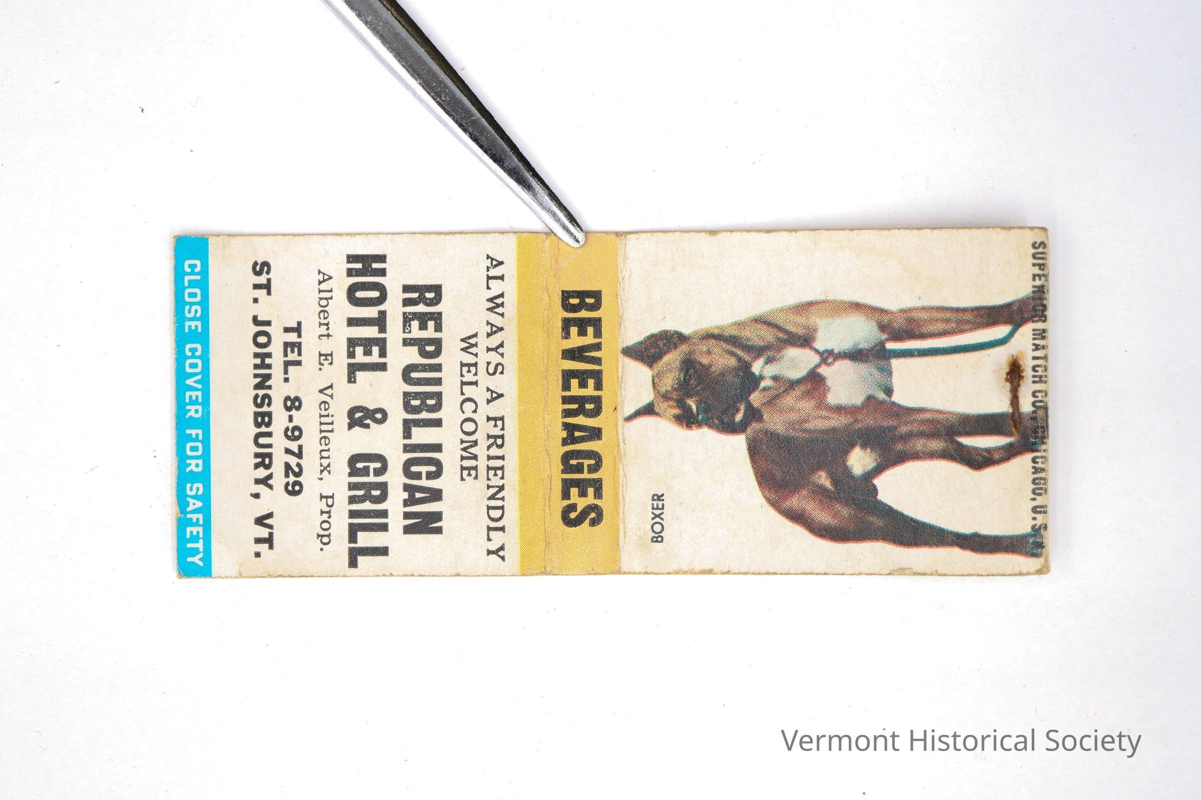 White cardboard bifold matchbook. The front flap is printed with the inscription, "ALWAYS A FRIENDLY WELCOME / REPUBLICAN HOTEL & GRILL Albert E. Veilleux, Prop. TEL. 8-9729 ST. JOHNSBURY, VT".