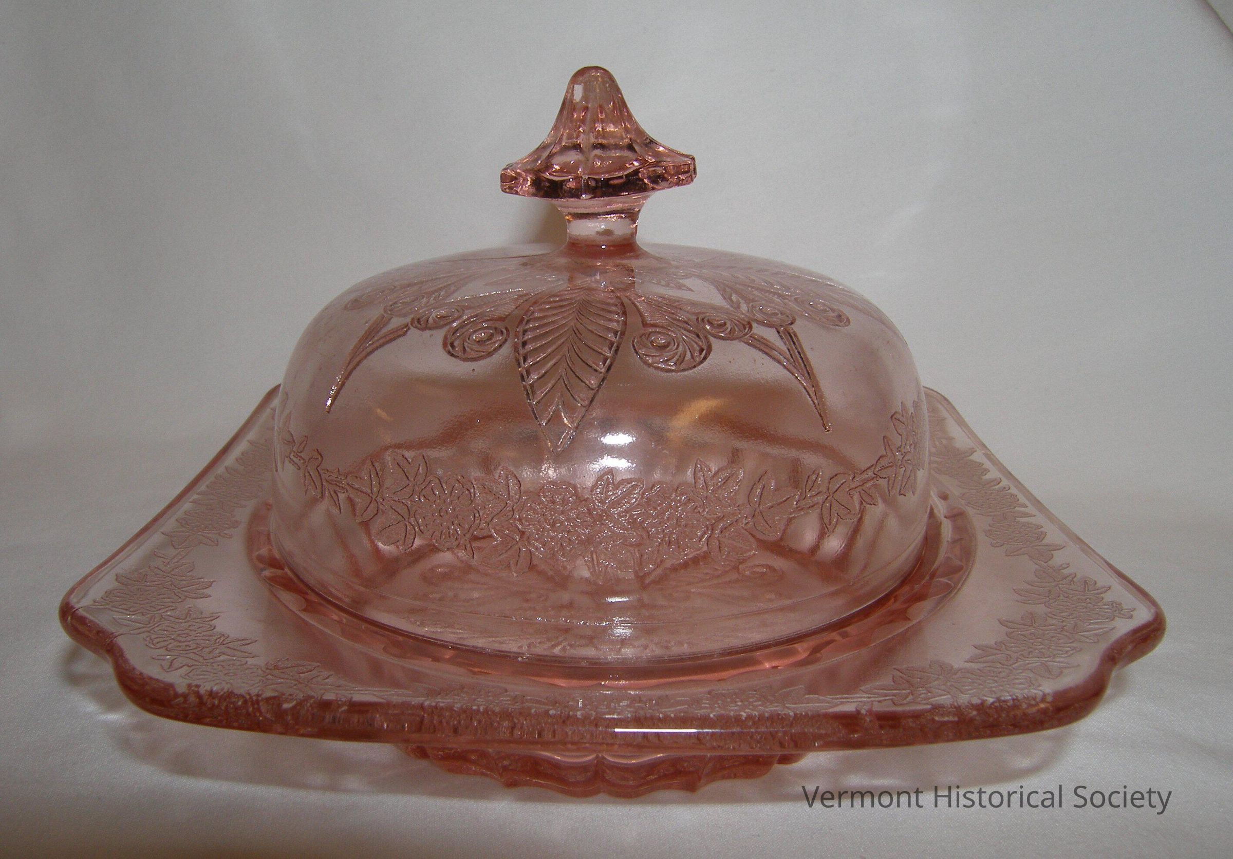 Pink glass butter dish consisting of a dish and cover. Both the dish and cover are heavily decorated with stylized poinsettias and leaves molded into one side of the glass to appear etched.