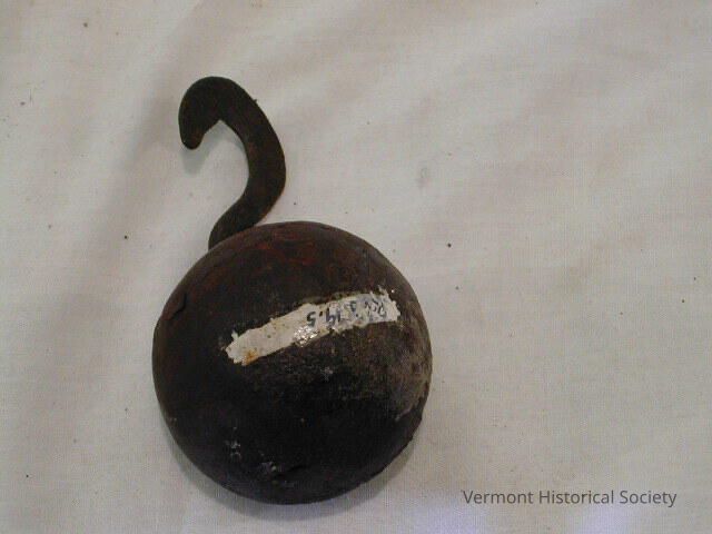 Round metal weight with a hook attached to one side. It weighs 2.5 pounds.