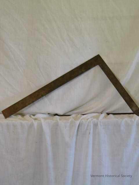 Steel square with 24" blade, 16" tongue, both tapered. A number of scales are struck on the back side. The front is marked off in 1/8" with numerals hand struck in the metal. At corner is the mark, "Hawe Patent/Warranted steel/B. Harmon".Context