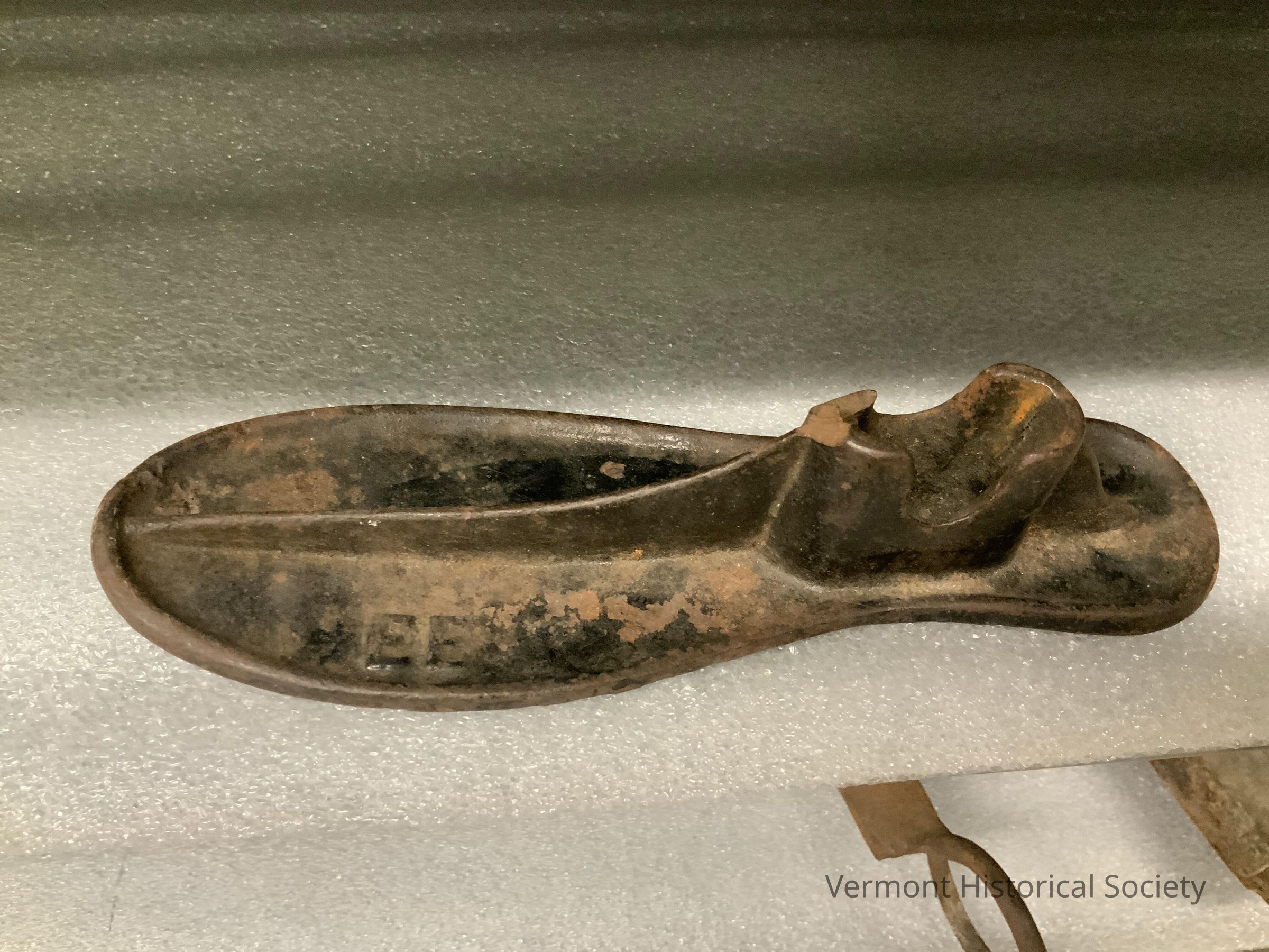 Metal couplers last in the shape of a shoe. The last is sized for an adult foot. The initials EE are molded into the top. The sole is not shaped.