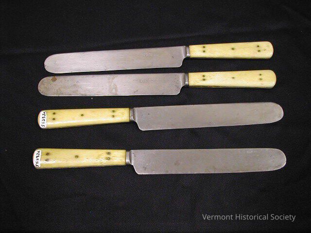 Four knives with ivory handles. The blades are dull and rounded at the tip. The handles are riveted on. The blades are marked, "Lamson Goodnow & Co. S. Falls Works".Context