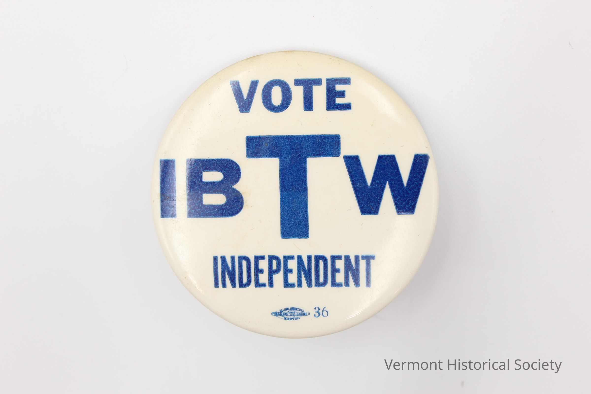 Round, white pin. At the top of the pin is the word "VOTE" written in blue. In the center of the pin "IBTW" is written in blue with the T a size larger than the other three letters. At the bottom half of the pin is the word "INDEPENDENT" also written in blue. Beneath the word "INDEPENDENT" is an oval logo and the number 36 also in blue.