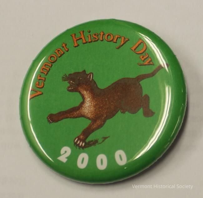 Round, green button with the orange inscription, "Vermont History Day" at the top, an image of a leaping catamount in the center, and the date "2000" at the bottom.Context