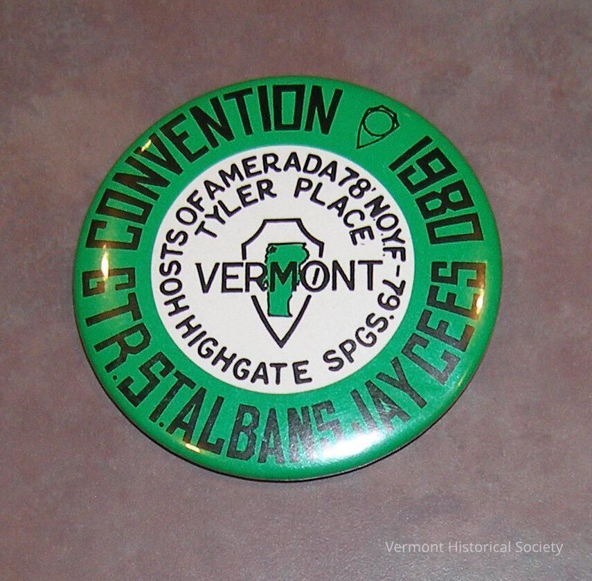 Round metal button printed with a white center a green edge border. The border is printed in black with the inscription, "CONVENTION / 1980 / GTR.ST.ALBANS.JAYCEES". The inner circle is printed with an image of Vermont [green] with the outline of a shield [black] under the word "VERMONT" [black]. It is surrounded by the words, "HOSTS OF AMERADA 78' N.O.Y.F.-79' / HIGHGATE SPGS."