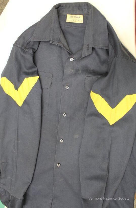 Long-sleeved navy blue shirt. The shirt opens up the center front and secures with six plastic buttons. There are two breast pockets, each with secured by a flap and button. A yellow cotton chevron has been applied to each sleeve.Context