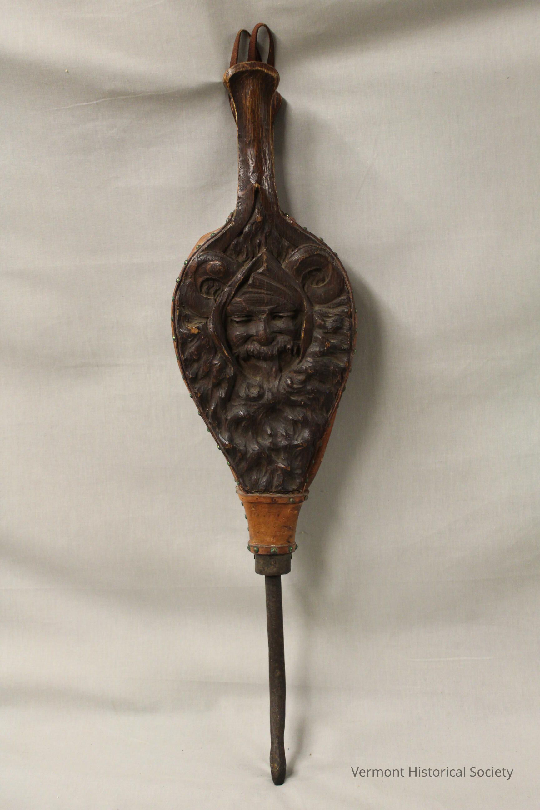 This is a fireplace bellows that is made of carved wood, metal, and leather. The front side of the bellows is delicately hand-carved to resemble the face of a man with acanthus leaf designs stemming outward around the face. The back side is also carved with an open circular hole in the center, surrounded by curved lines that spiral outward, with a decorative border around the edges.