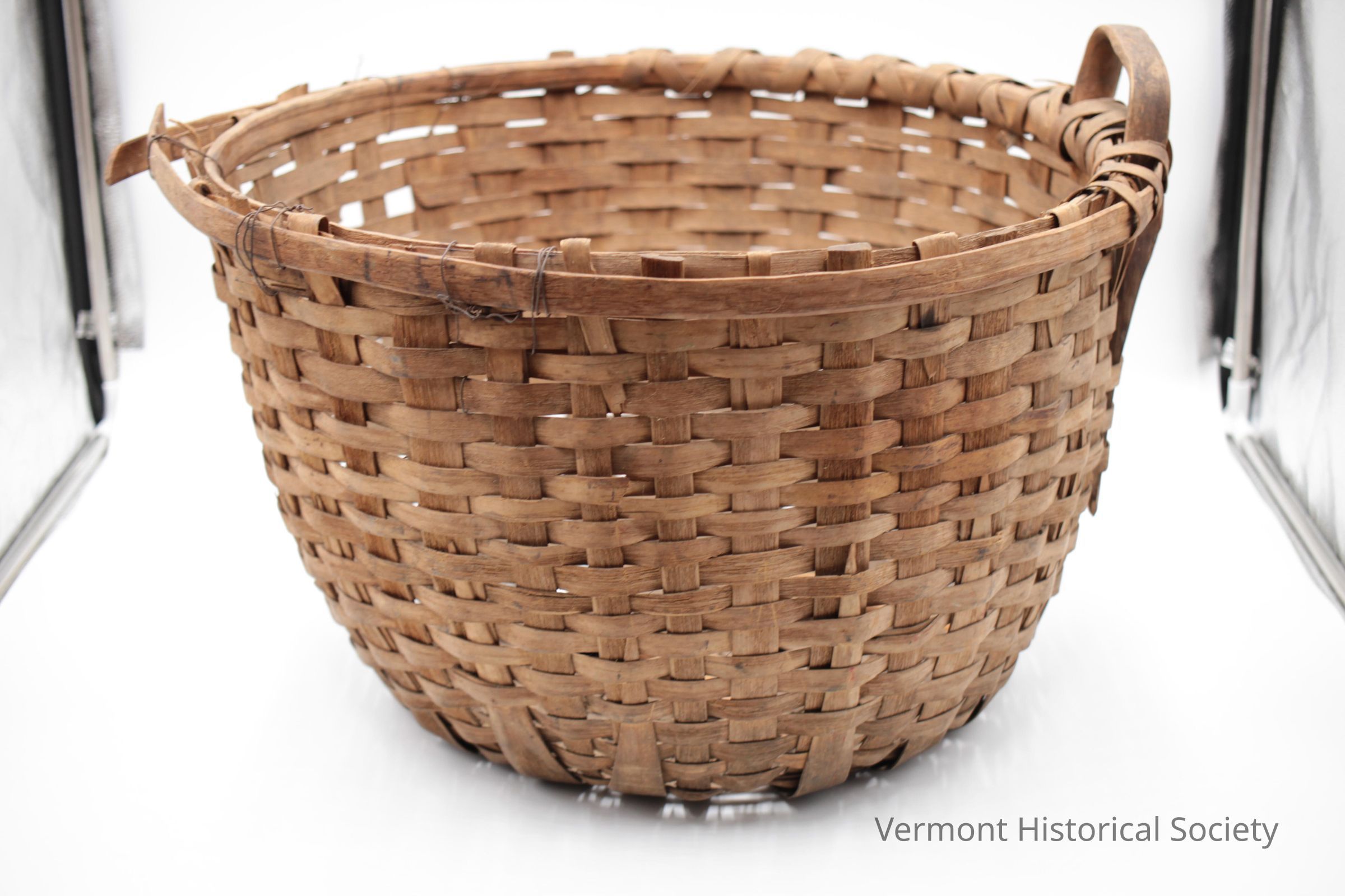 Large bushel basket with Sweetser-style bottom. The bottom is woven of wooden splints, and the top edge is reinforced with multiple splints wrapped with another narrow splint. Where the splint wrapping is missing, it has been replaced with wire. One of the U-shaped handles is no longer attached.Context