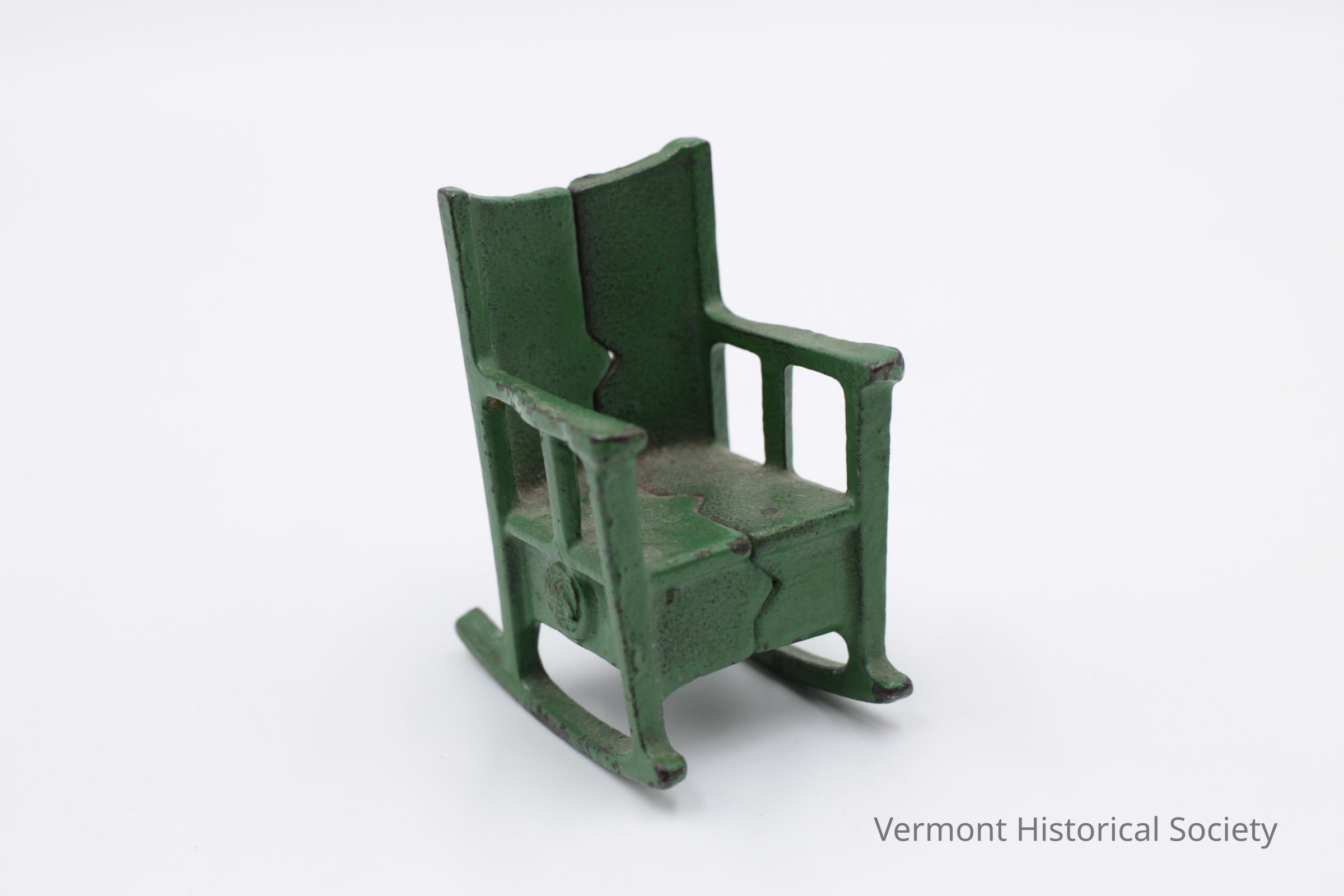 Miniature rocking chair sized for the dollhouse. The chair is made of cast iron and painted green. It has arms and a solid back piece. There is a seam running up the center back and center seat.Context