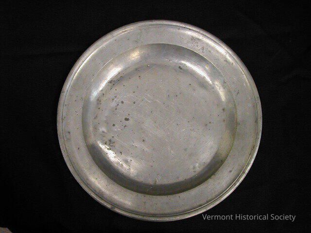 Pewter dinner plate with deep central well. The plate is marked, "Robt. and Tho. Porteus", "Grace Church", and "S.A.".Acquisition