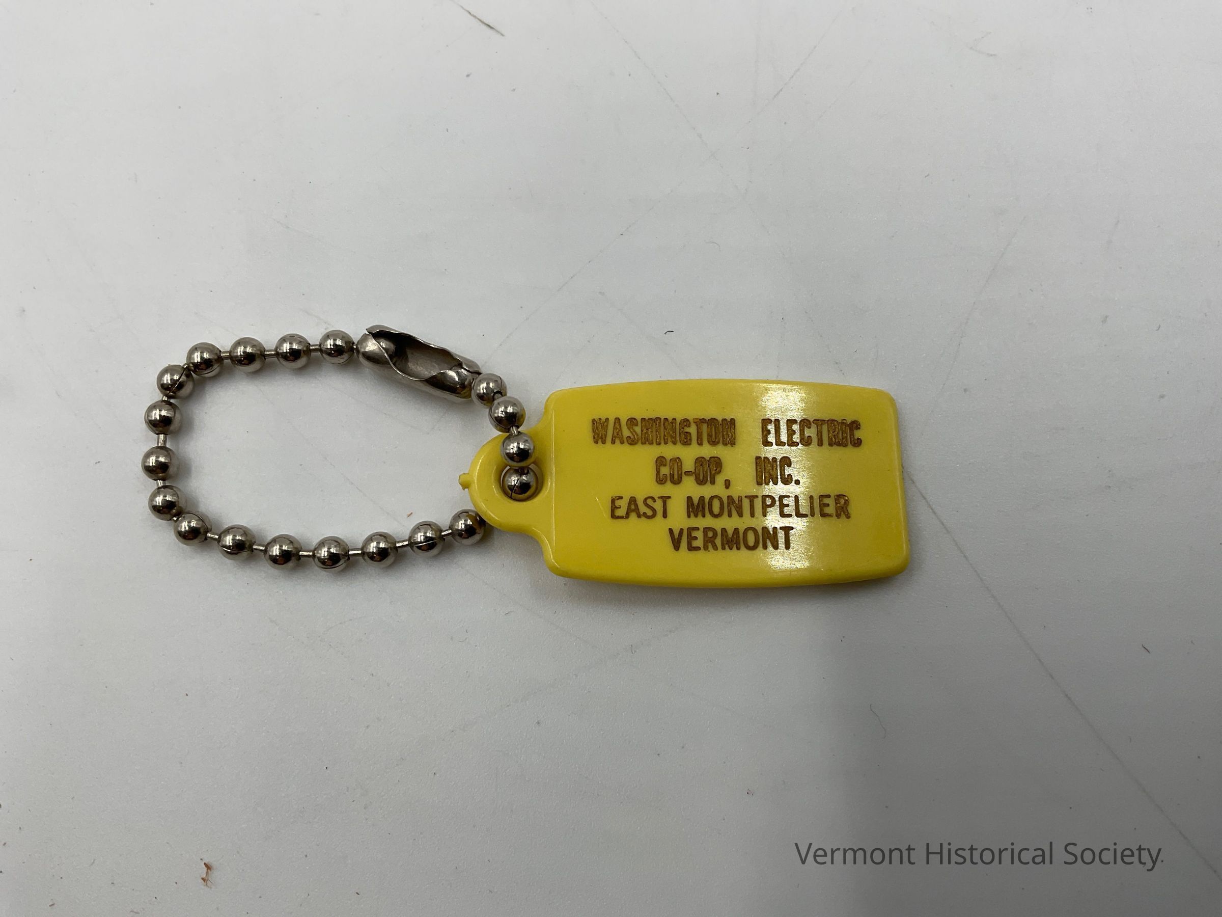 Yellow plastic tag on a chain for keys. It promotes Washington Electric Co-op of East Montpelier, a small electric power company.Context