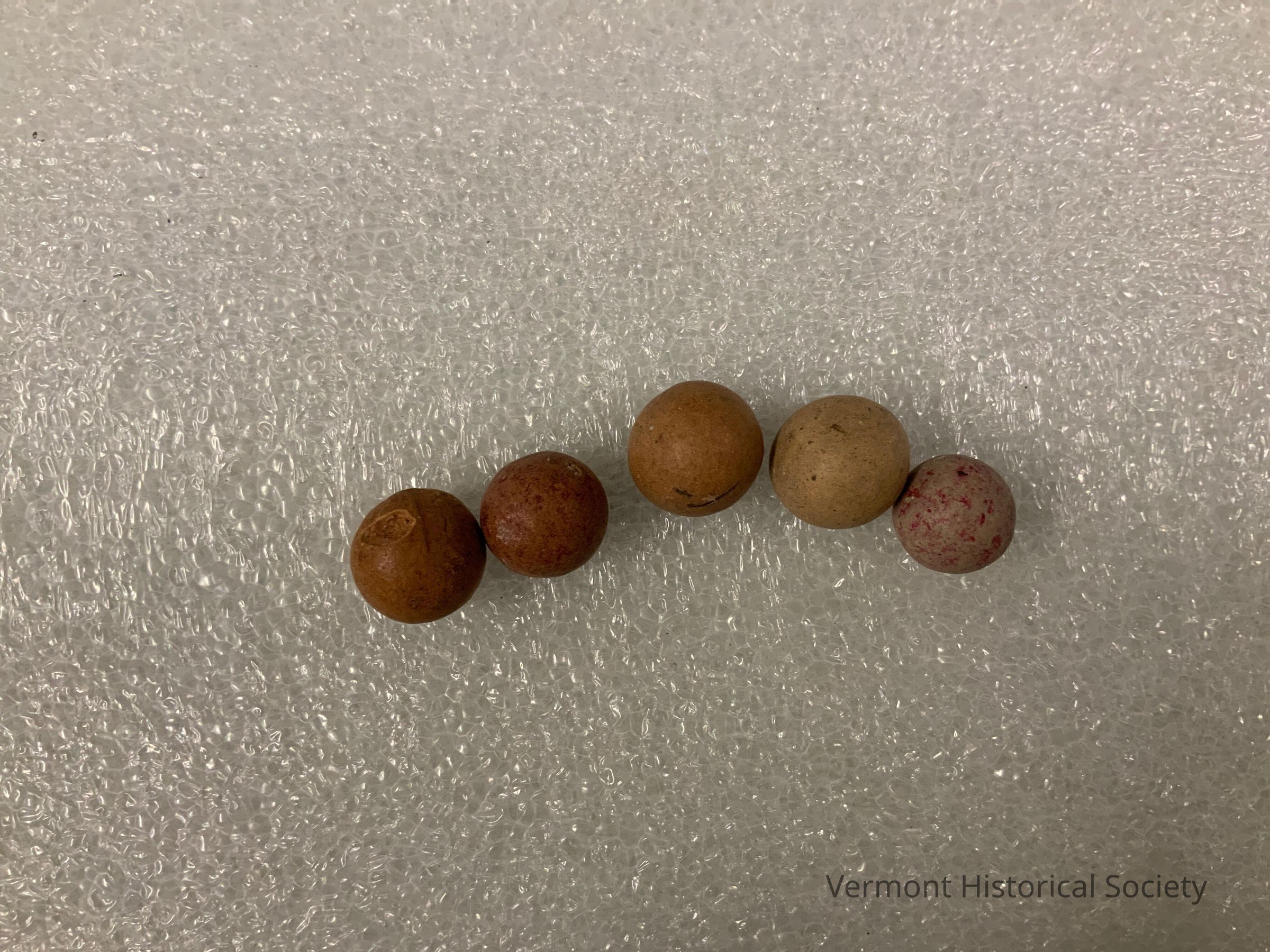 5 clay marbles. Each is speckled.
