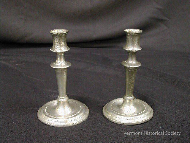 Pair of unmarked pewter candlesticks. The candlesticks have a round base and flare outward twice on the shaft.