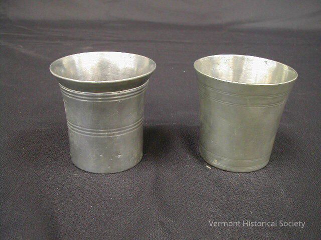 Two pewter beakers. Each beaker is flared outward toward the top and decorated with horizontal banding in groups of three. One beaker has the word, "Andrews" scratched into the base. The other has the word, "Bingham" engraved into the base.