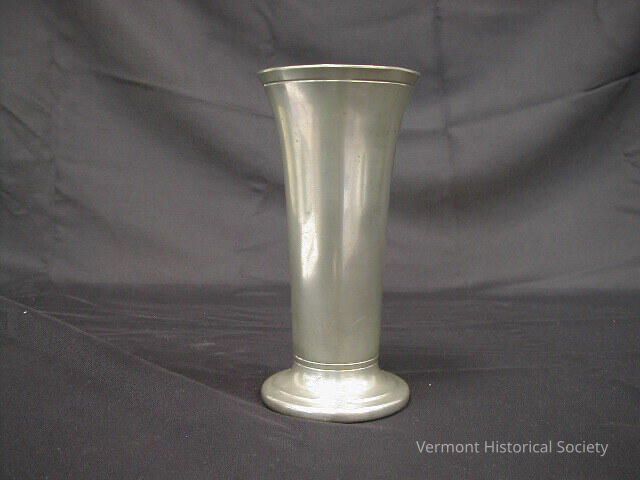 Tall, cylindrical pewter beaker. The beaker flares outward toward the top and is decorated with an incised line at the top and two near the base. The bottom is marked, "CS Co., Pewter P181" with a symbol of an evergreen tree.